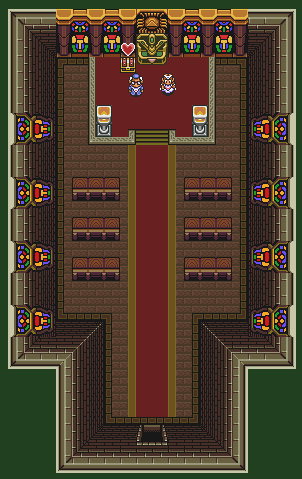 You find yourself in the throne room. One of the few times Zelda stops you to give you advice, she tells you which way to push the ornamental shelf.