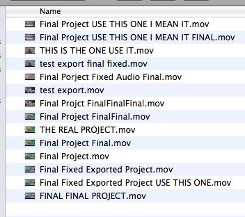 File naming policies can be as important as personal password policies. If you decide ahead of time that all your files (or exports) will follow the same pattern (LastNameFirstInitial – Project Name – Version Number) then you will not be worried when it comes time to save your file. You’ll save everything correctly and be able to find the latest version of your video every time.