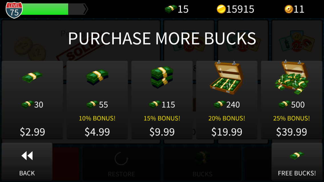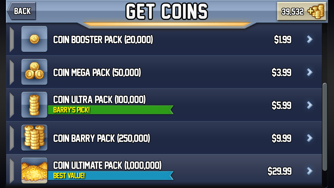 The game has a store where you can buy coins and dollars for real-money, the prestige tokens are only available if you complete the missions. When compared to prices in Jetpack Joyride though, the prices are magnitudes more expensive. As I went from one game to the next I was a bit shocked at the prices, these are, after all, digital goods.