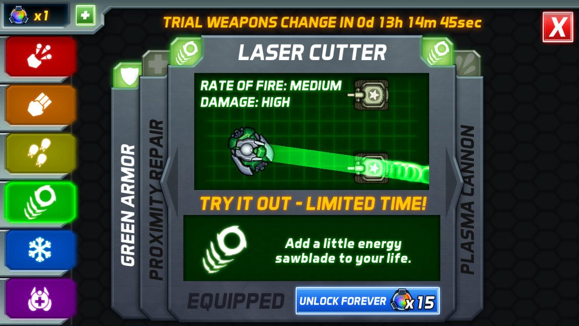 This is great design because it allows you to test out all the weapons before you are required to spend your Prisms on something. Where Pocket Mine asked for money to buy things, sight unseen, Colossatron lets me use everything, provided I am willing to do it on their terms. If I find a weapon that I really like or is really useful, such as Repair Drones, I am invited to unlock it forever.