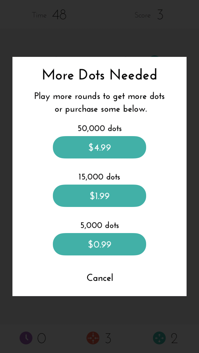 Dots is all about connecting dots. For every dot you connect, it gets added to your bank. At the end of each round you can buy power-ups using the dots you collected. If you run out of dots and need more you can spend real money to buy dots.