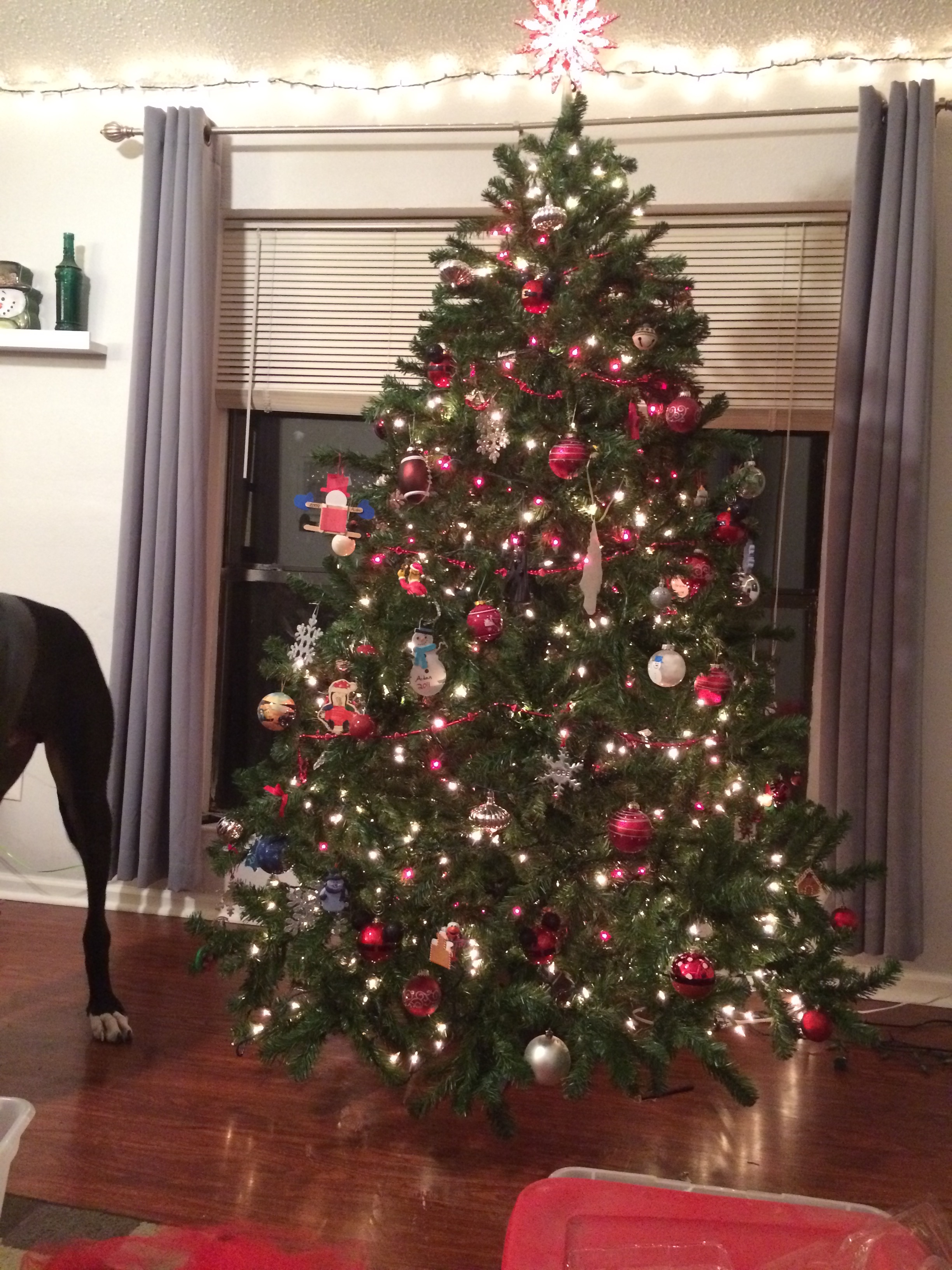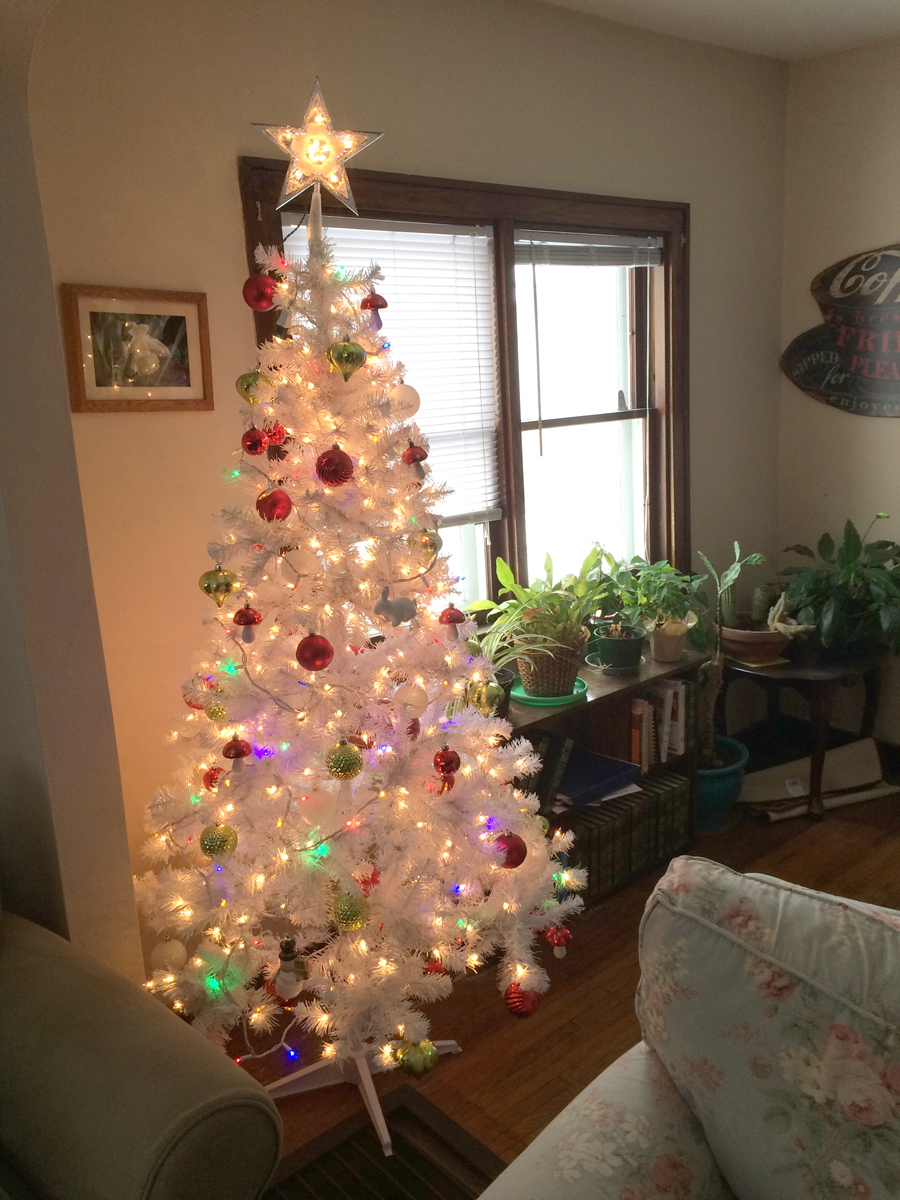 A few minutes later I’m home. Things are pretty quiet, so I turn on some Christmas music and put up my Christmas tree.