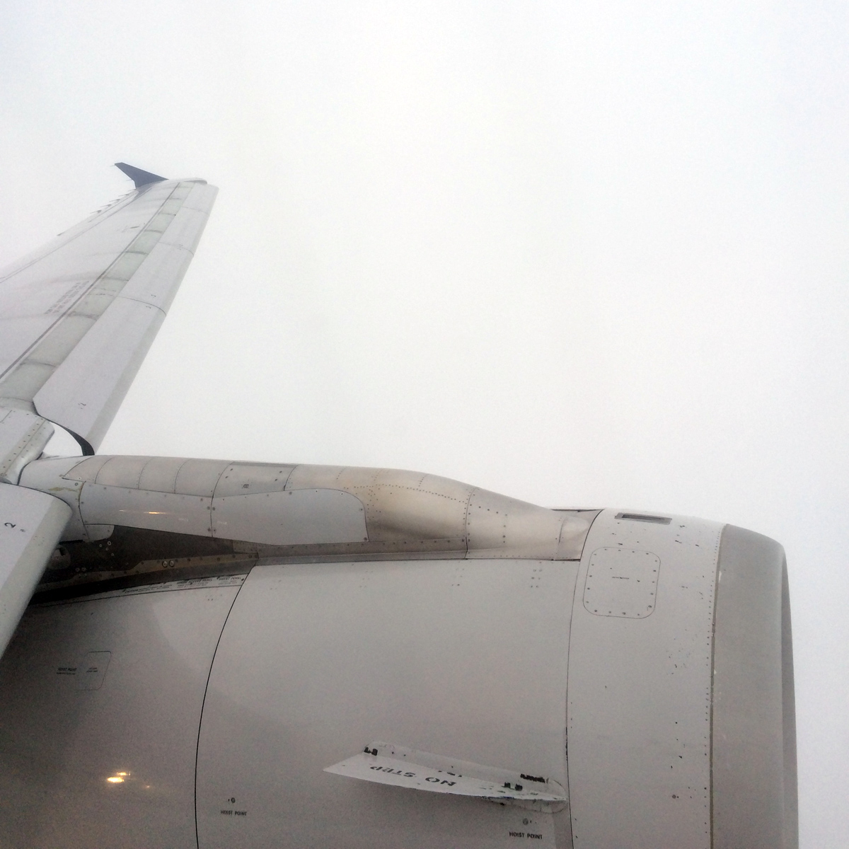 I’m kinda excited, because I want to see this place from the sky. What I don’t realize is that the low hanging clouds are only a couple hundred feet off the ground. By the time we reach the end of the runway, it’s completely white outside my window. Huh. That’s kinda cool I guess.