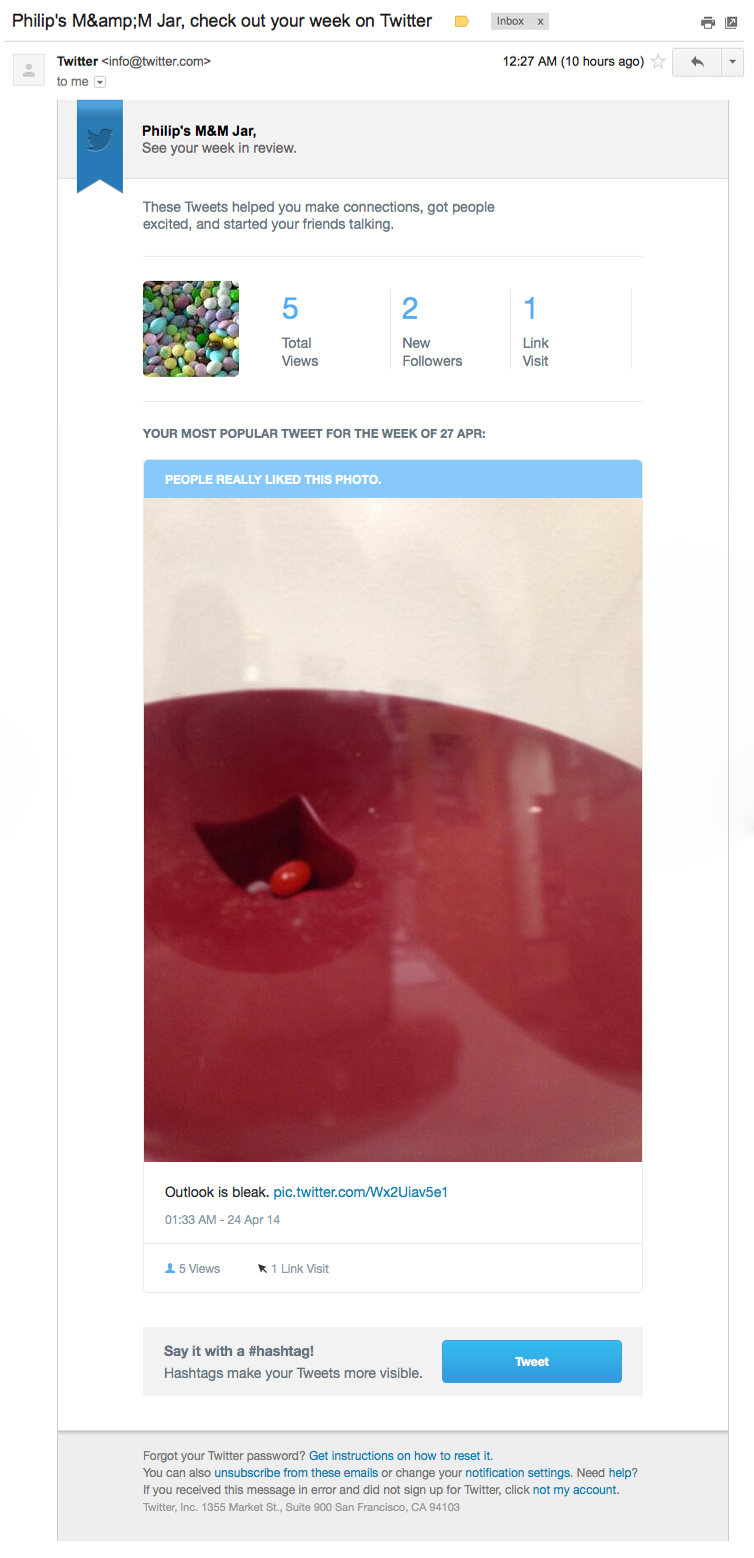 My “favorite” message from this week was a notification from Twitter telling me about my activity on Twitter this week: I posted a single tweet.