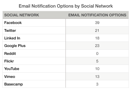 I probably shouldn’t be surprised, but Facebook (currently) has 39 different notifications which can come to you via email. Google+ has 32, Twitter has 21, and LinkedIn has 18. I have none of these boxes checked, but I’m pretty sure they still send me email anyway.