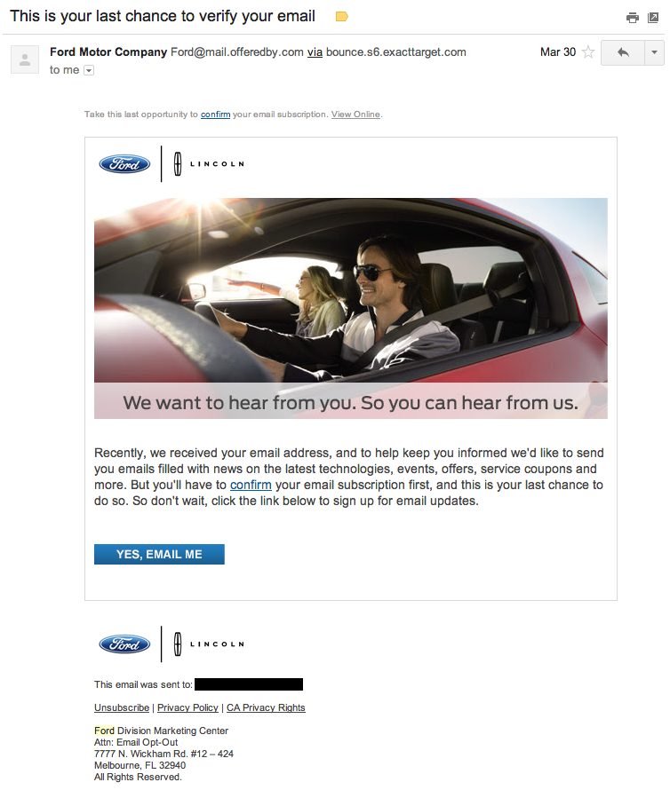Ford, asking me to verify my email (multiple times), though I didn’t give it to them.