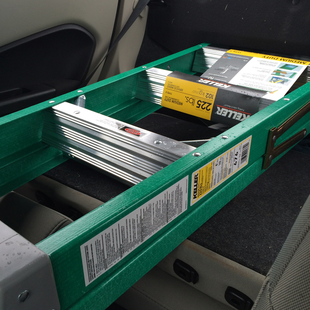 It was truly a "Garage Door Fools" miracle! Not only was I able to fit the 6' tall fiber glass ladder into the trunk of my Ford Fiesta, I was also able to get it out again! Talk about awkward future conversations...