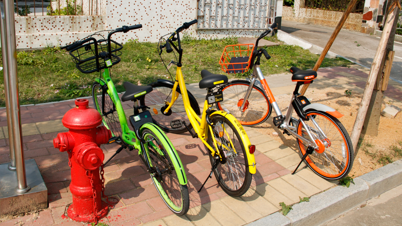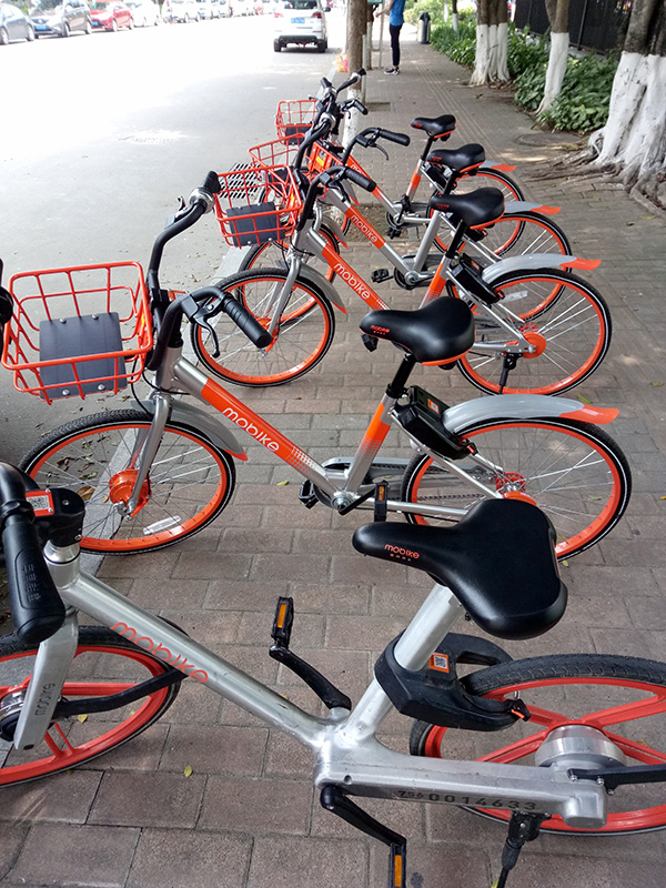 Mobike is a bike-sharing company. Within a month or two of these bikes appearing green bikes from U-bicycle and yellow bikes from OFO also stared showing up on sidewalks. Each uses a similar business model.
