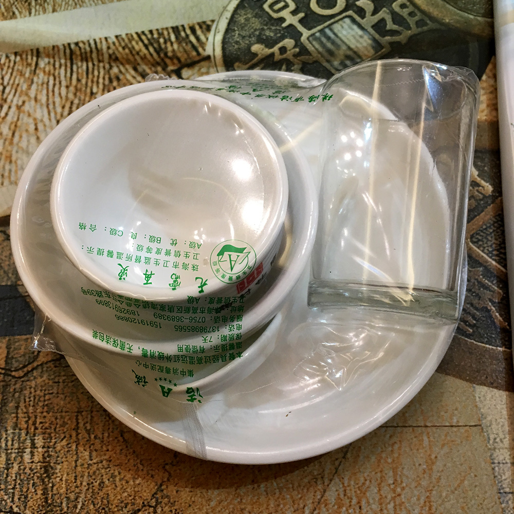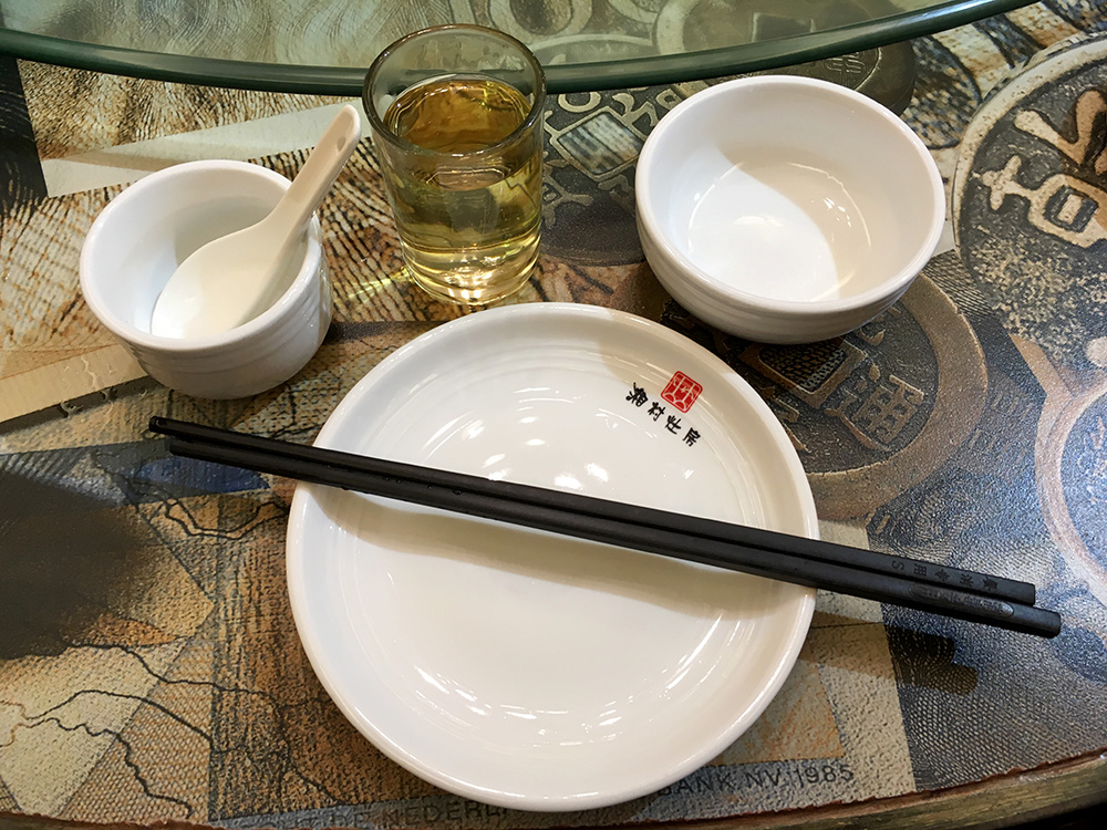 A place setting sits near each chair. It consists of a small five inch plate, a small three inch bowl, a porcelan spoon, and a small two inch tea cup. Occasionally there is another small glass included as well. Sometimes these dishes are wrapped together in heat-shrunk plastic. When this is the case, the black plastic chopsticks are used to puncture the wrapper. Remnants of plastic can be placed in the small bowl that sits on the lazy susan.