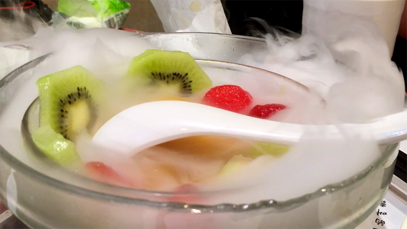 Another sit down, family style meal. (Family style is when you order a bunch of dishes and share them all.) We had chicken feet, buns with custard inside, dumplings, and a couple other dishes I didn't take photos of. (Typically when ordering family style you make sure you have at least one meat dish and one veggie dish. Usually you get an assortment of each. Normally we order one more dish than we have people to make sure we have enough food.) We finished our meal with a fruit and tofu pudding that came served on dry ice.