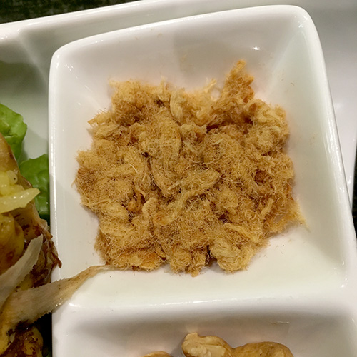 The fried rice contained shrimp and bits of squid or octopus. A small dish of cashews and meat floss came with the meal.