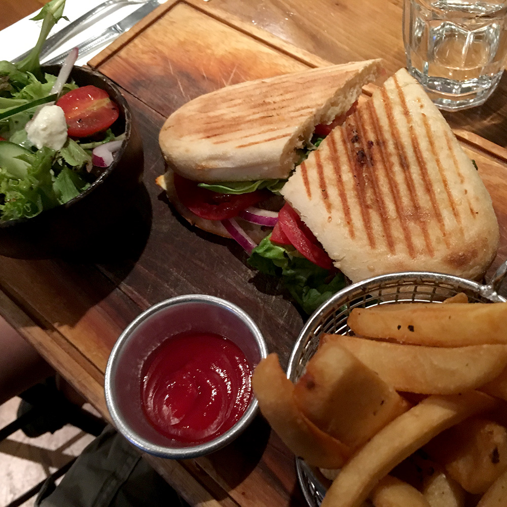 We spent most of the day walking and riding the outdoor escalators up the hill toward the midpoint. When suppertime came we found ourselves near a small pub. Large barrels are used as tables and create a neat aesthetic. They serve burritos and burgers. Burgers sound really good to me, and "Steak Sandwich" catches my eye.