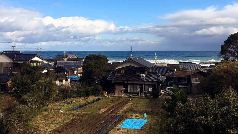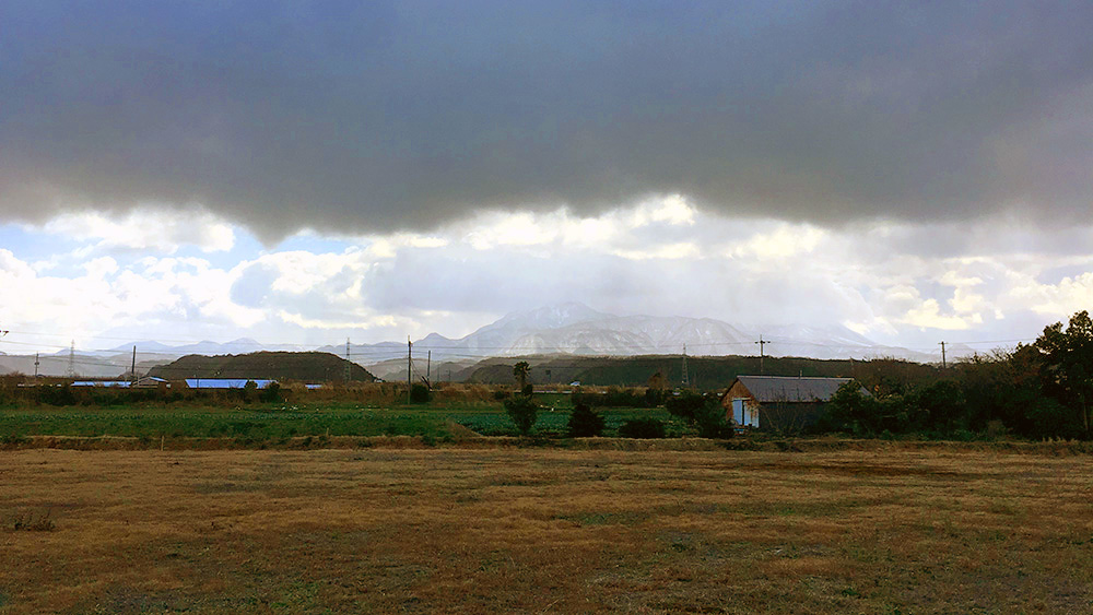 Down the hill is a small village, I think the name is Hatai. We stop partway down the hill and just enjoy the view. A couple of trucks drive through town, but beyond that it's completely peaceful here. There's no train, no ocean, just quiet. Daisen is again covered with clouds, but it's still a lovely sight.