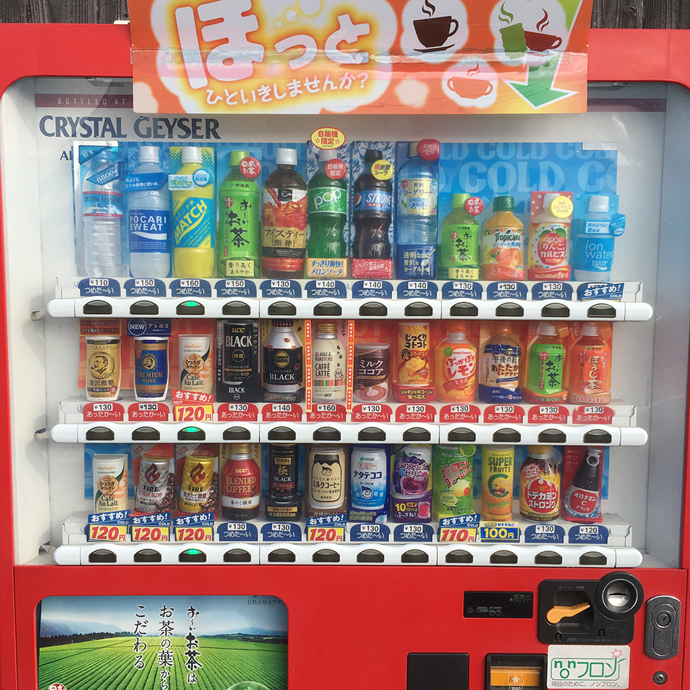 After lunch we brave the slightly warmer weather for another walk. This time we go in the other direction and look at the hills and mountains on the horizon. We go past a vending machine that serves hot beverages. It keeps coffee and tea warm for purchase. For ¥160 I can get a metal can of Caffe Latte which is almost too hot to hold.