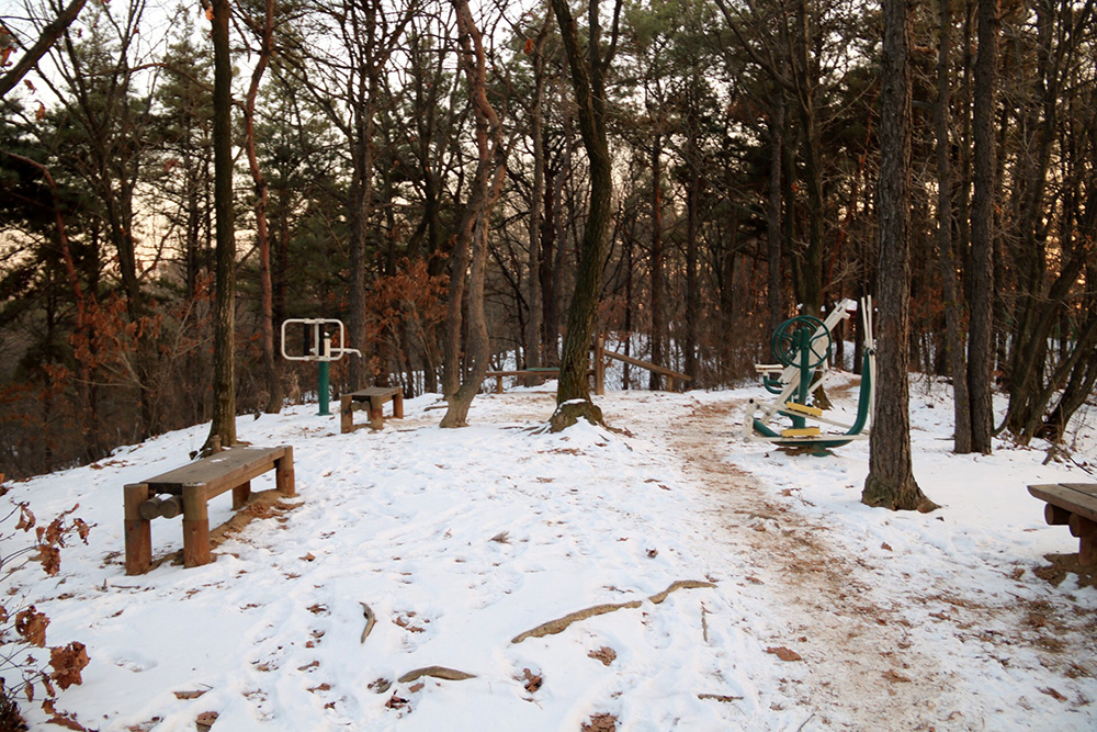 Finally, I reach the top of the hill and I find two things. There are benches to sit on and rest. I'm hot now, actually sweating a little under my multiple layers, but the thought of sitting on a frozen bench is repulsive. The second thing I see is exercise equipment. Because, like you and me, when the Koreans get done hiking to the top of a hill, the first thing on their mind is working out.