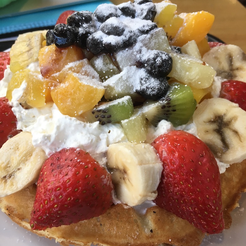 A small rush of people crowd the space over the lunch hour, but for most of the day only a couple of patrons gather to eat and chat. Beans Bins serves coffee and waffles. The waffles are covered in whipped cream and fruit. The one I order around 1:30pm came drowning in whipped cream and topped with strawberries, blue berries, pineapple, bananas, and kiwi. I'll never look at a waffle the same way again.