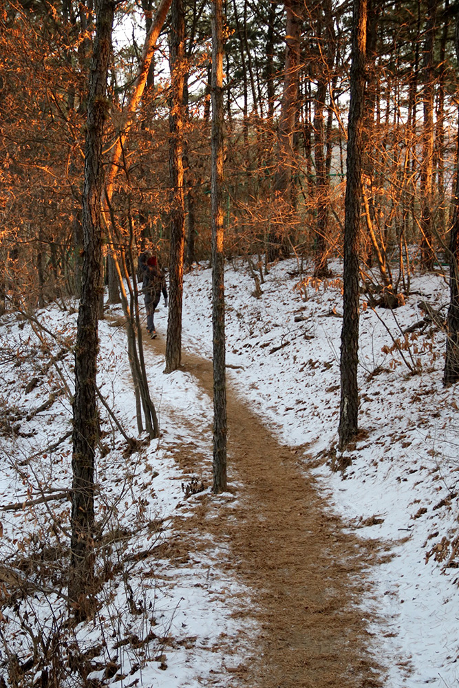 An inch of snow covers the ground, but the path is clear as day. It's reddish brown against the white surroundings. The path is soft to walk on, a natural carpet of pine needles, and even the dirt feels soft under the soles of my shoes.