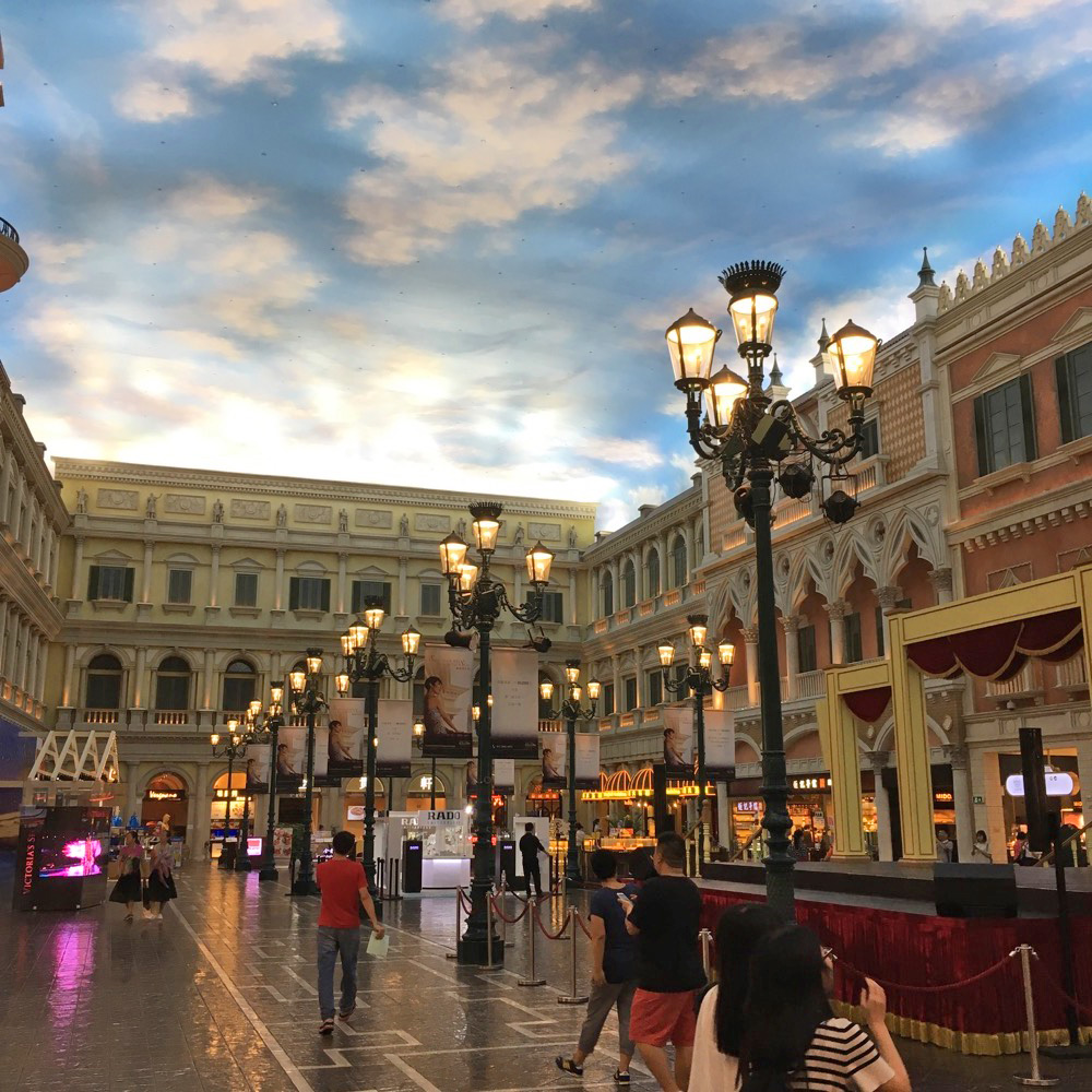 The second floor is very reminiscent of the Venetian in Las Vegas. The tall arched ceiling is painted blue with clouds and evenly lit to give you the feeling of being outside... if outside was was lit by small dim lights reflected off a blue and white surface instead of being lit by the sun. High end shopping centers line the walkway which runs along a short canal. An empty gondola is tied to some steps. The bottom of the canal is scattered with coins from China, Hong Kong, and Macao. There'e even a few paper dollars sunk along the bottom.