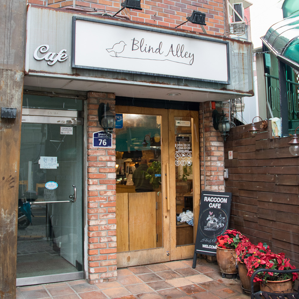 A large sign portrays an outline of a bird and handwritten text proclaiming Blind Alley. The sign hangs over two doors. The left one is all glass and looks like it enters a small apartment complex in the upper levels. To the right is a rustic looking wood and glass doorway. A small sandwich board sign read "Raccoon Cafe, Blind Alley, Welcome."