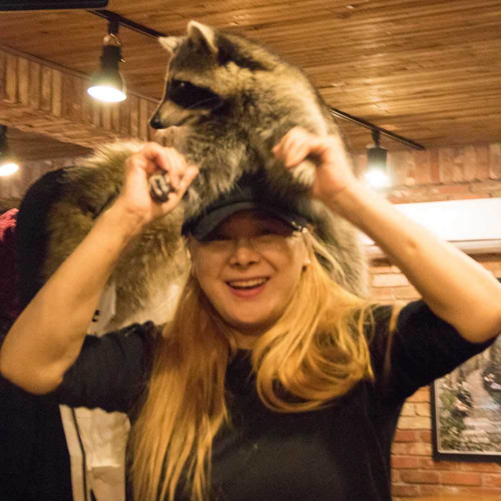 A swinging half door creates a second barrier just inside the cafe. Presumably, this keeps the animals in. I order a coffee at the counter. The three of us decline paying the extra fee to go into the raccoon room. It was only like ₩4,000 or something, but it was unnecessary, the raccoons are loose in the cafe today.