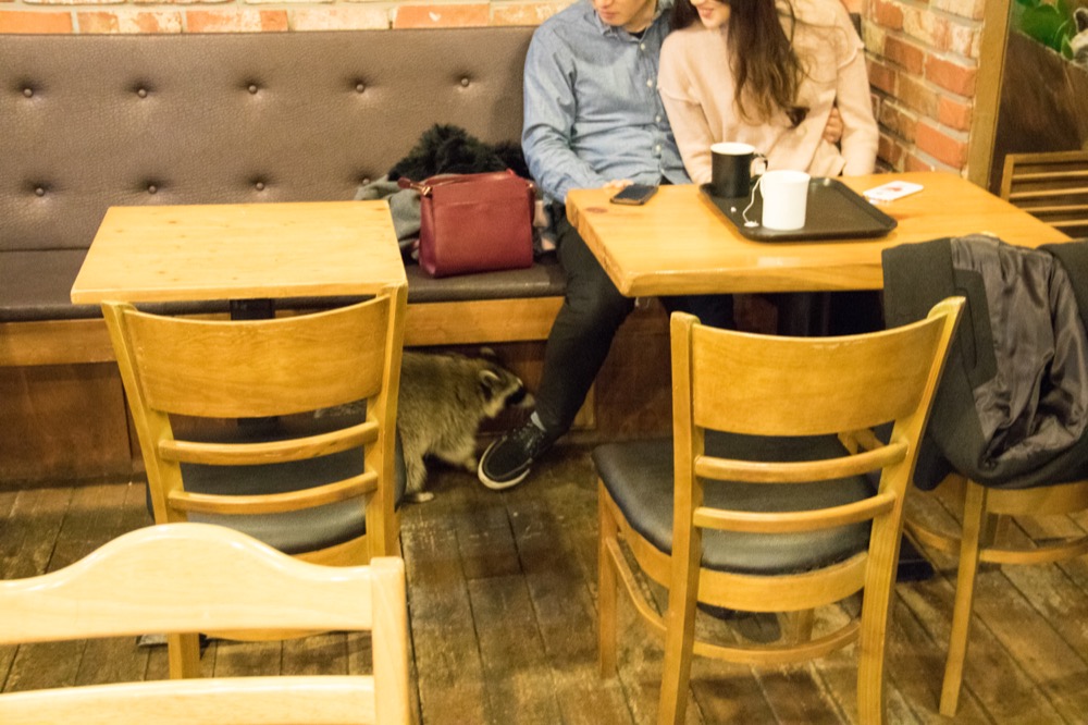 We take a table near the back. A window in the wall opens to the Raccoon room. A Raccoon crawls upside down along the ceiling. At the edge of the room it a door with a window in it. We can see several people standing in the raccoon room.