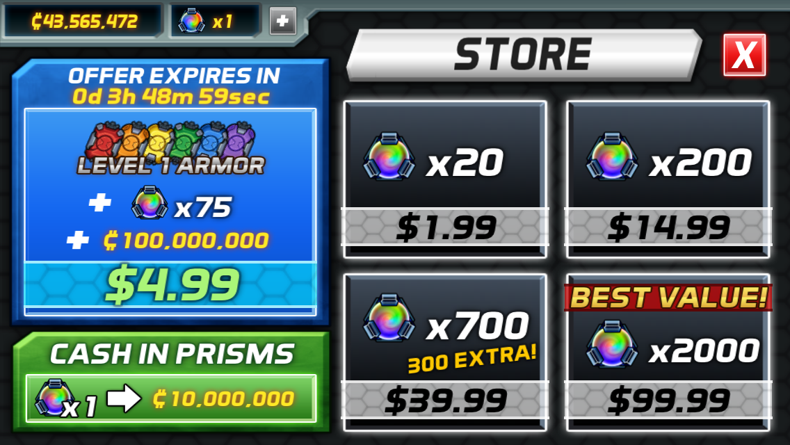 Finally, they have a set use-case. Yes, you can use Prisms to get more cash and you can use them to continue your game when you lose, but the main use for Prisms is weapon upgrades. The game allows you to purchase four levels of armor upgrades for each of the different colored pieces. These require an increasing number of Prisms for each level, but the armor upgrades are yours to keep.