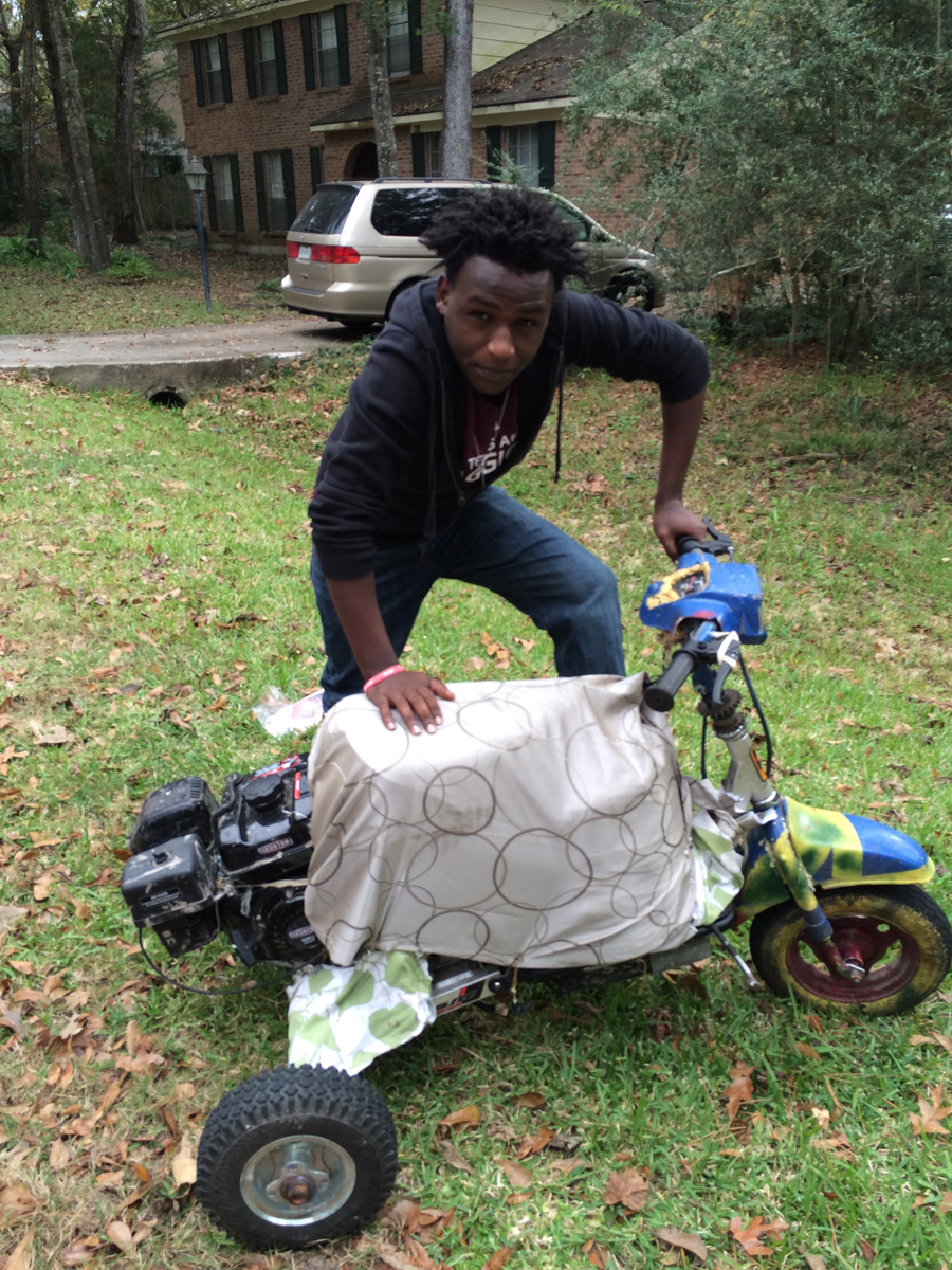 Oh, I should introduce a few more characters. Let’s call Marie’s husband Brad and their adopted son from Ethiopia, Sol. Sol is a mechanical genius who disassembled all of the family’s bikes for parts. He shows me his new moped, which is, as far as I can tell, a 150cc motor bolted to a three wheeled frame. It rides a few inches off the ground and gets up to 30 miles per hour. I’m told the seat is made with pillows and jackets and is wrapped in a shower curtain. I don’t know what’s more impressive, that he made this by himself or that he hasn’t killed himself with it yet.