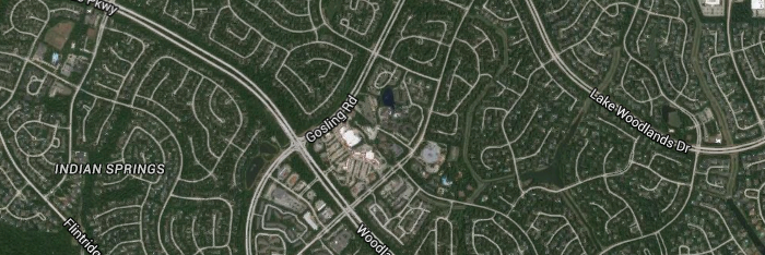 We’re driving to The Woodlands, which is a heavily populated area with the feel of a northern resort. Every street is lined with 50 foot tall trees and thick undergrowth on each side. You’re basically driving through a forest, except on the other side of the trees are houses, shopping malls, Walmart, or fast food joints. But like the elusive Bigfoot, you never see any of them.