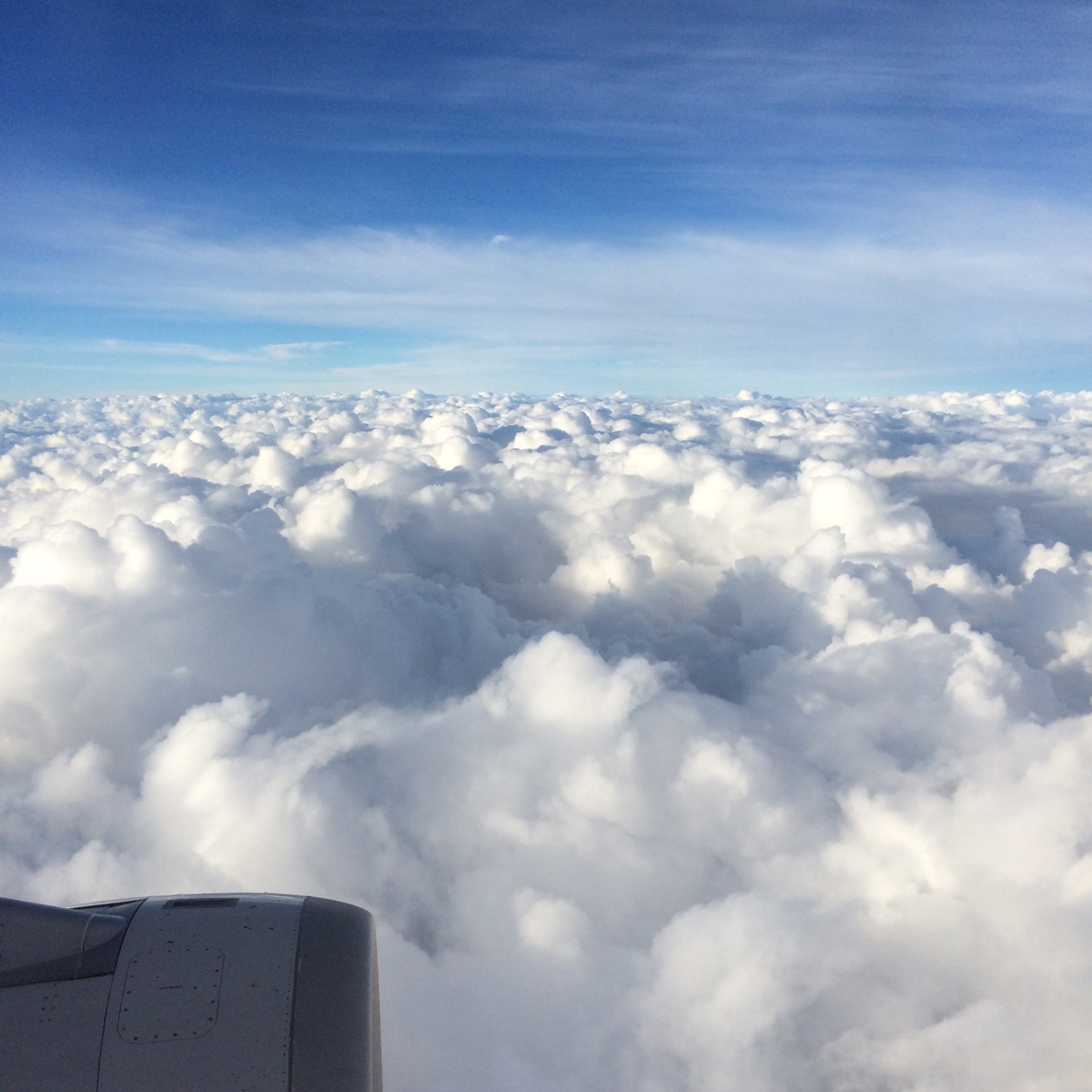 We break through the clouds and it’s the first time I’ve seen sun in four days. It’s beautiful. The white clouds look so tangible and the blue sky is amazing. I want to stay here forever… except I’m on an airplane and I’d rather be at home.