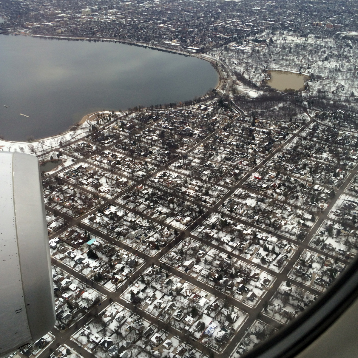 When we get to Minneapolis there’s snow on the ground and little grids of houses. It’s as close to the opposite of The Woodlands as you can get. All the little ants look like cars from up here. Little models that would be fun to reach out and touch. As if they aren’t even real.