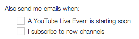 "Also send me emails when: I subscribe to new channels." – YouTube notification settings.