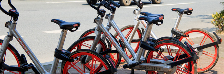 Mobike is a bike-sharing company. Within a month or two of these bikes appearing green bikes from U-bicycle and yellow bikes from OFO also stared showing up on sidewalks. Each uses a similar business model.