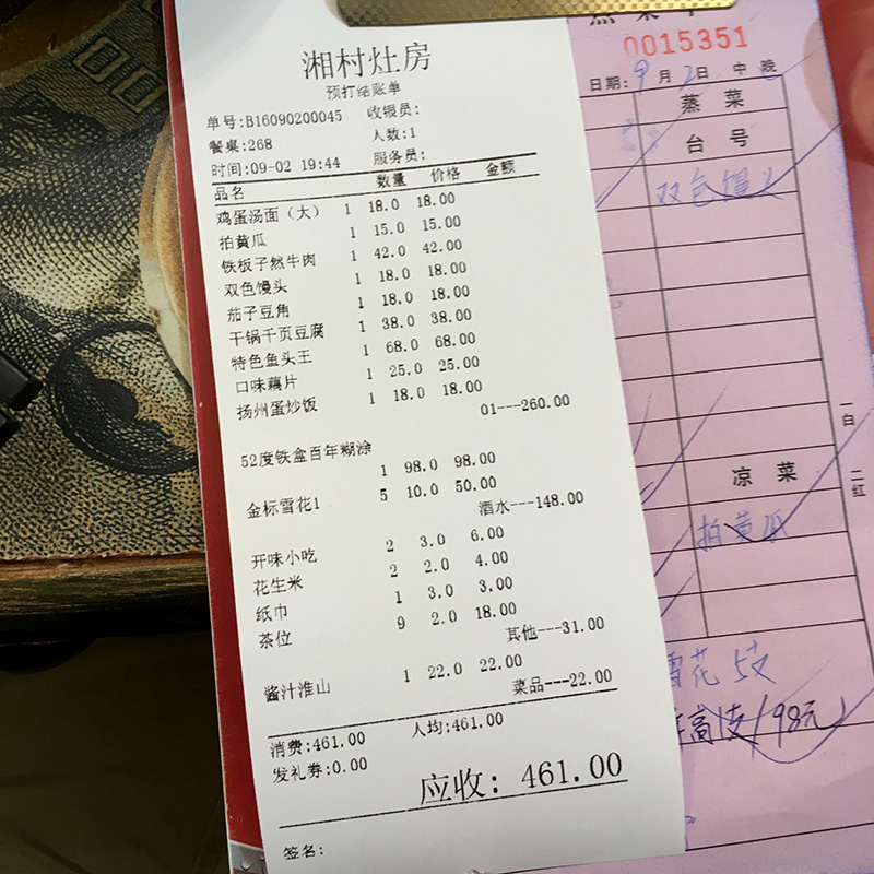 After everyone has had their fill they bring the check to the table. A meal of this size will usually run between ¥300 and ¥600 which will break down to ¥30 to ¥50 per person. (That translates to just about $5 to $7 USD.)