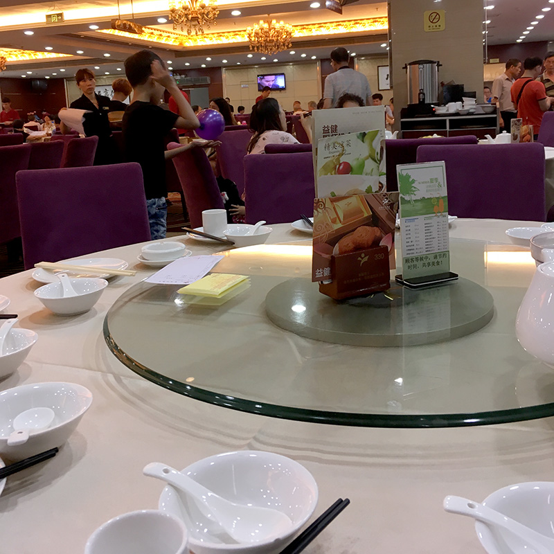 A place setting sits near each chair. It consists of a small five inch plate, a small three inch bowl, a porcelan spoon, and a small two inch tea cup. Occasionally there is another small glass included as well. Sometimes these dishes are wrapped together in heat-shrunk plastic. When this is the case, the black plastic chopsticks are used to puncture the wrapper. Remnants of plastic can be placed in the small bowl that sits on the lazy susan.