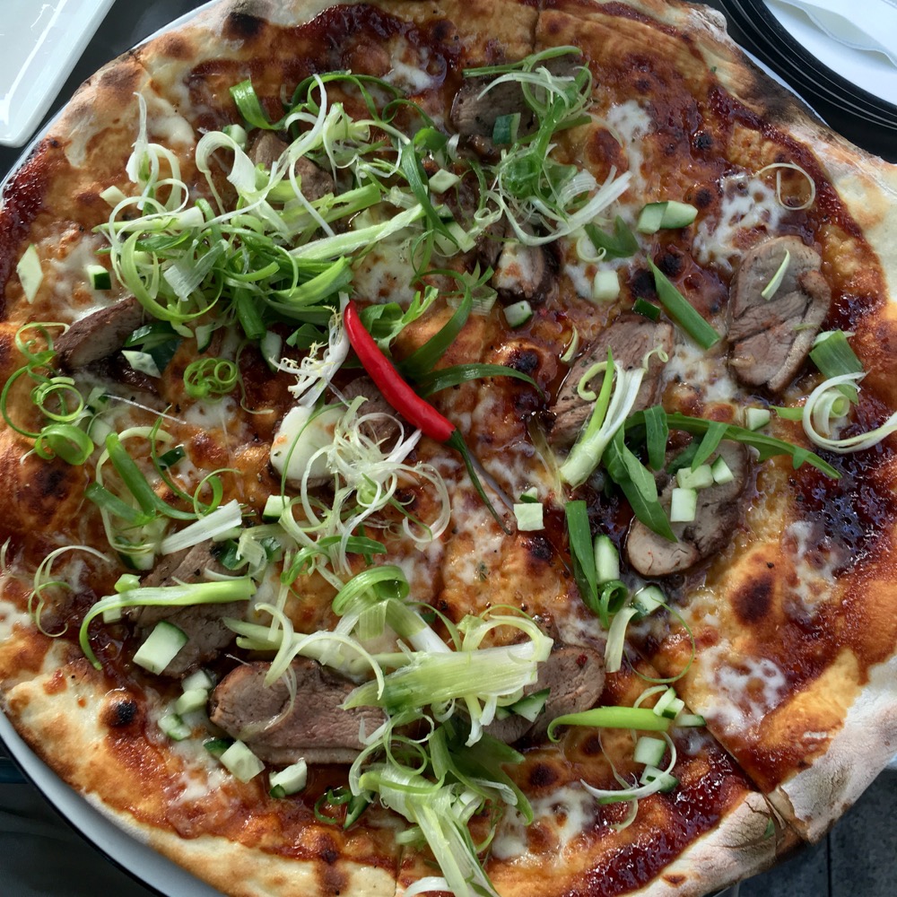 I also order the Peking duck pizza. The menu says Pizza Express gives a set amount to a children's AIDS charity for each Peking duck pizza they sell. There's no tomato sauce, instead the Peking duck sits atop the cheese with shredded greens and is drizzled with a sweet and tangy sauce.