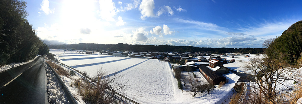 Down the hill is a small village, I think the name is Hatai. We stop partway down the hill and just enjoy the view. A couple of trucks drive through town, but beyond that it's completely peaceful here. There's no train, no ocean, just quiet. Daisen is again covered with clouds, but it's still a lovely sight.