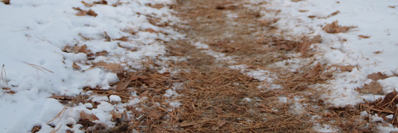 An inch of snow covers the ground, but the path is clear as day. It's reddish brown against the white surroundings. The path is soft to walk on, a natural carpet of pine needles, and even the dirt feels soft under the soles of my shoes.