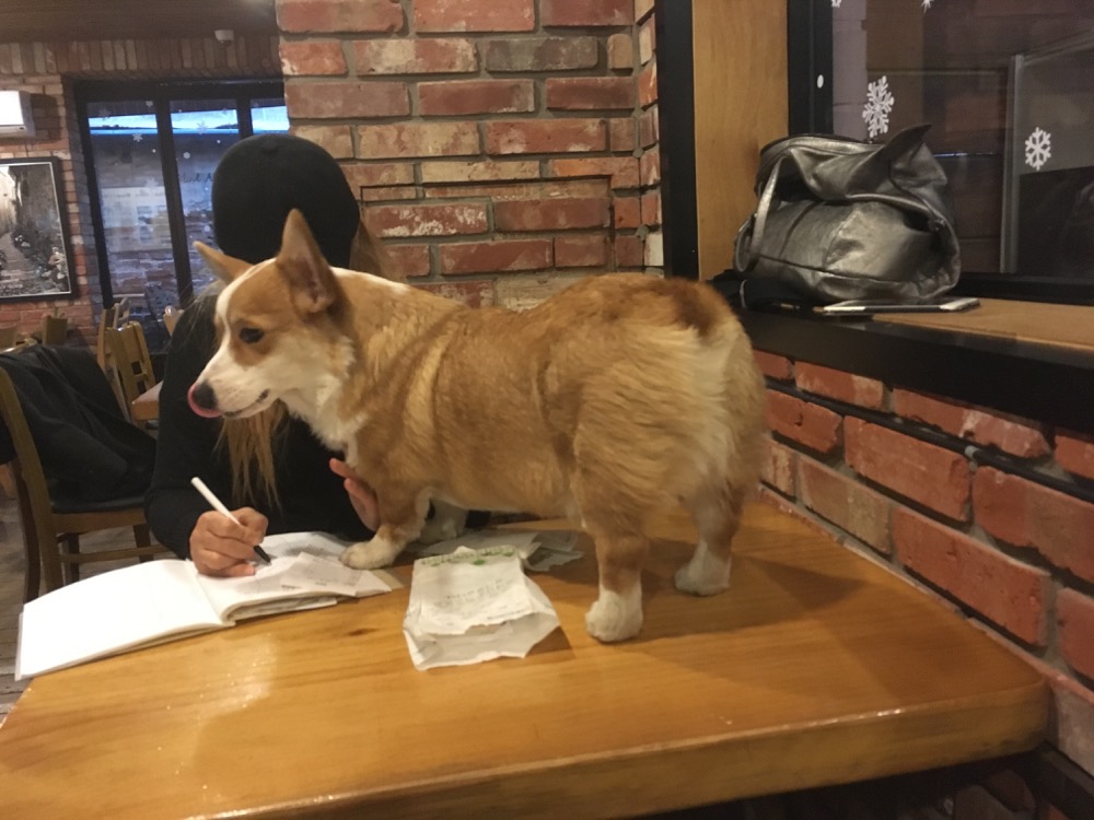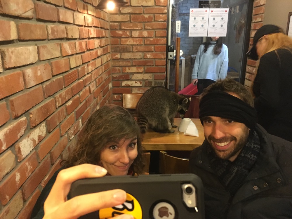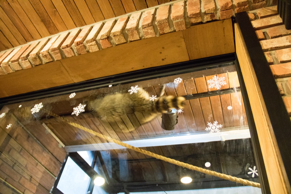 A swinging half door creates a second barrier just inside the cafe. Presumably, this keeps the animals in. I order a coffee at the counter. The three of us decline paying the extra fee to go into the raccoon room. It was only like ₩4,000 or something, but it was unnecessary, the raccoons are loose in the cafe today.