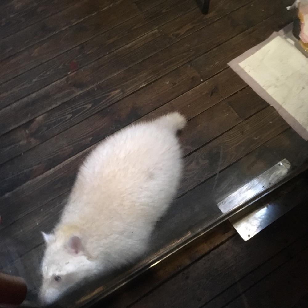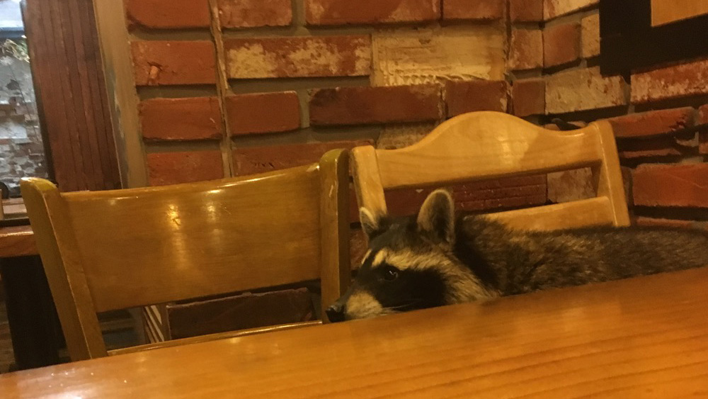 We take a table near the back. A window in the wall opens to the Raccoon room. A Raccoon crawls upside down along the ceiling. At the edge of the room it a door with a window in it. We can see several people standing in the raccoon room.